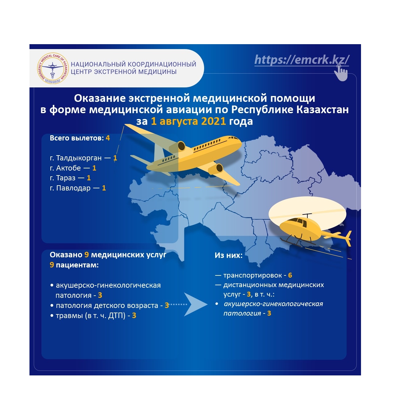 Оказание экстренной медицинской помощи в форме медицинской авиации по Республике Казахстан за 1 августа 2021 года
