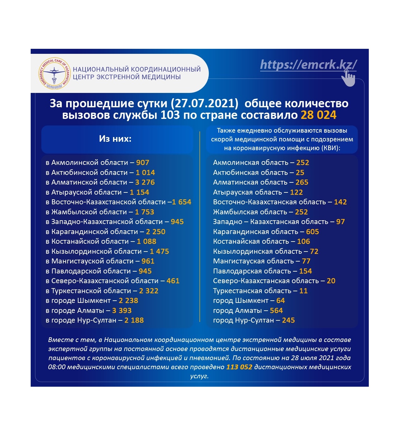 За прошедшие сутки (27.07.2021) общее количество вызовов службы 103 по стране составило 28 024