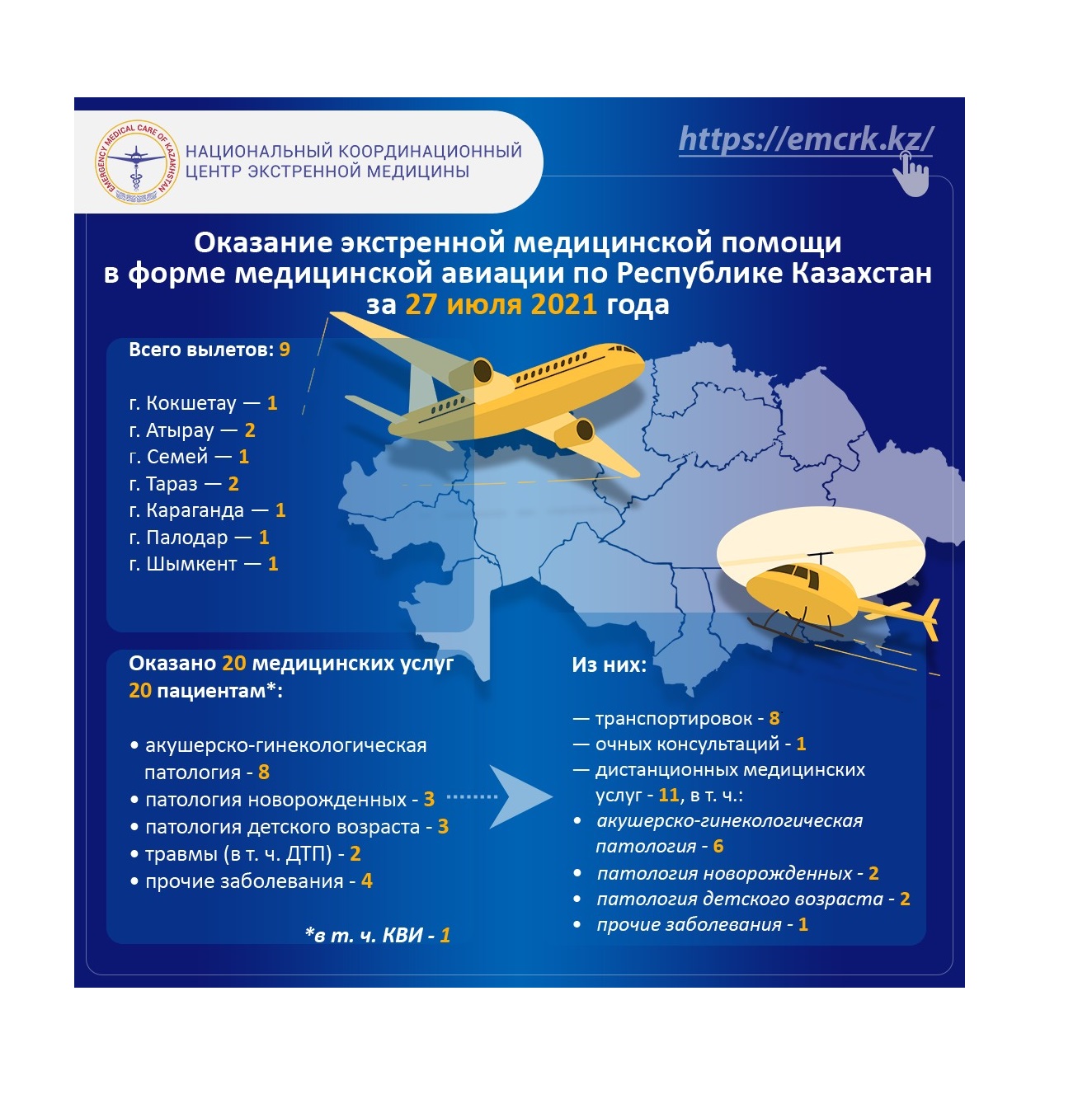 Оказание экстренной медицинской помощи в форме медицинской авиации по Республике Казахстан за 27 июля 2021 года