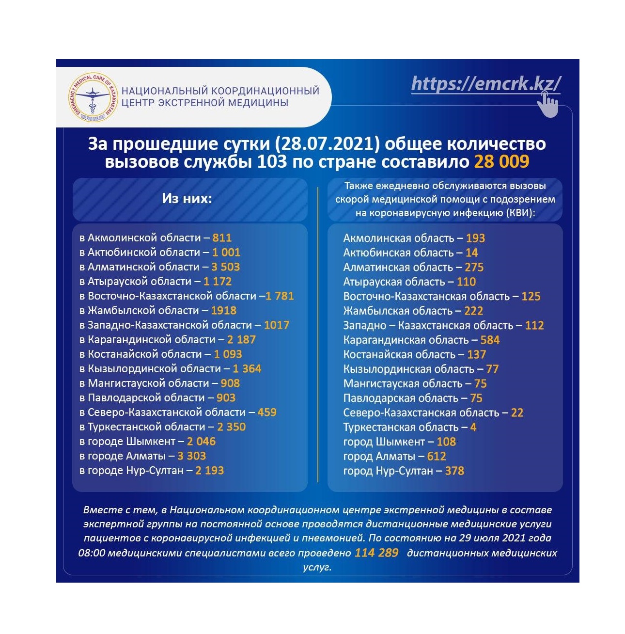 За прошедшие сутки (28.07.2021) общее количество вызовов службы 103 по стране составило 28 009
