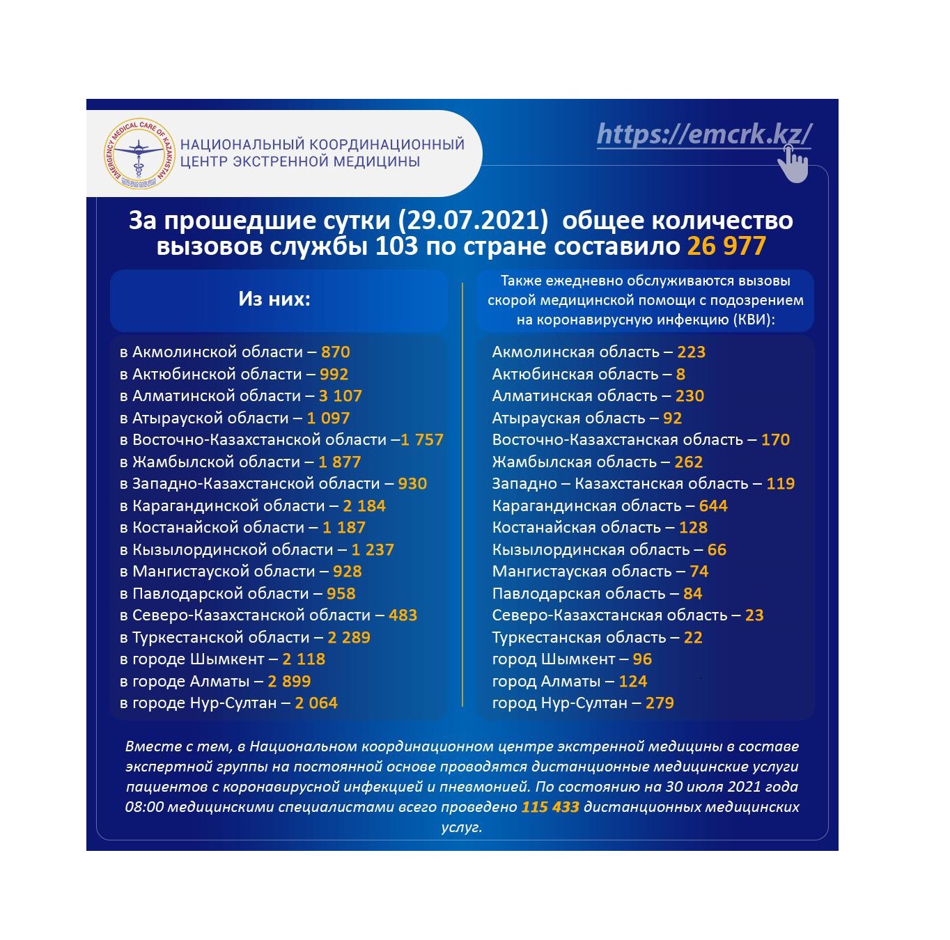 За прошедшие сутки (29.07.2021) общее количество вызовов службы 103 по стране составило 26 977