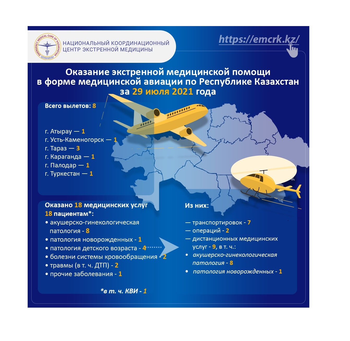 Оказание экстренной медицинской помощи в форме медицинской авиации по Республике Казахстан за 29 июля 2021 года