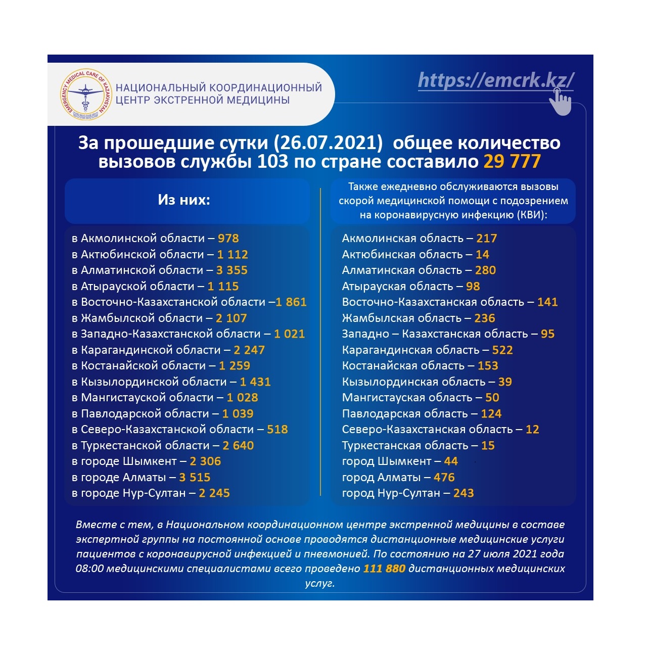 За прошедшие сутки (26.07.2021) общее количество вызовов службы 103 по стране составило 29 777