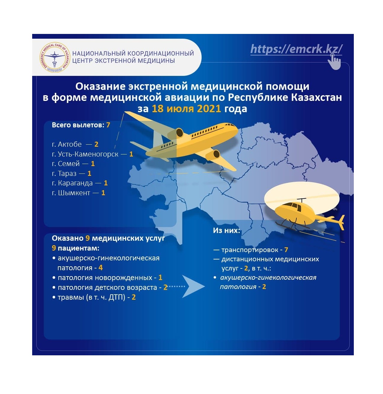 Оказание экстренной медицинской помощи в форме медицинской авиации по Республике Казахстан за 18 июля 2021 года