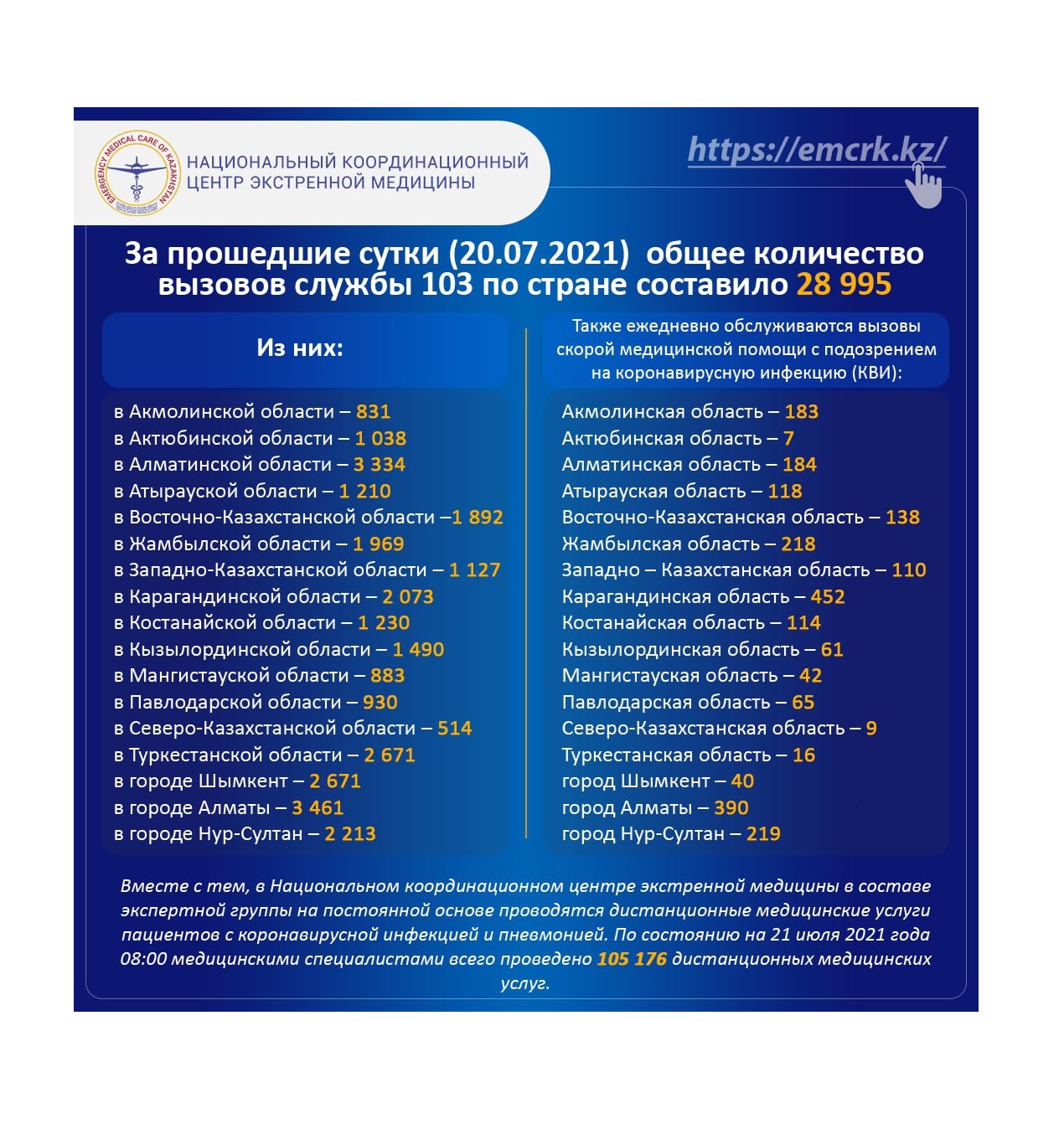 За прошедшие сутки (20.07.2021) общее количество вызовов службы 103 по стране составило 28 995