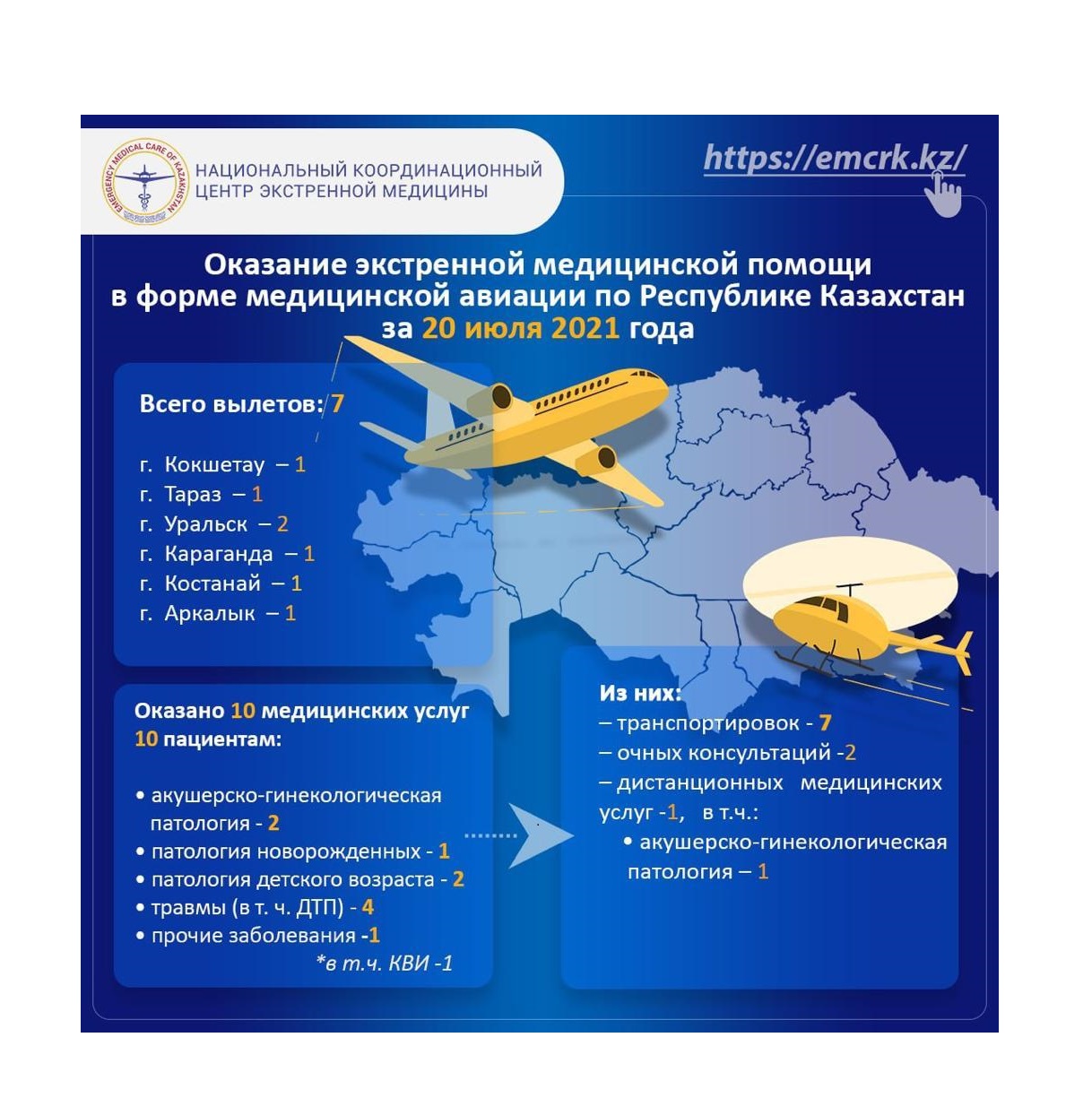 Оказание экстренной медицинской помощи в форме медицинской авиации по Республике Казахстан за 20 июля 2021 года