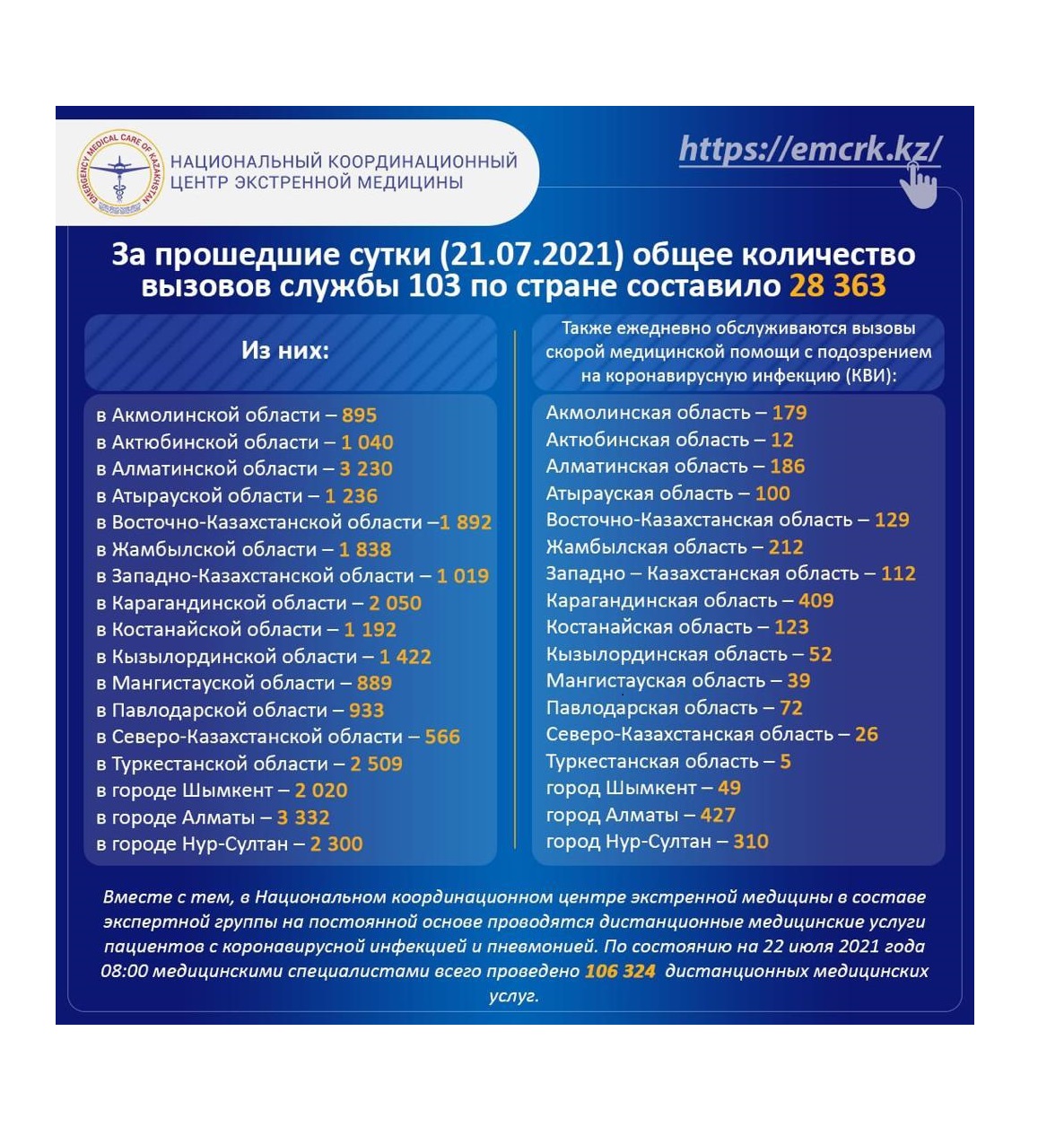 За прошедшие сутки (21.07.2021) общее количество вызовов службы 103 по стране составило 28 363