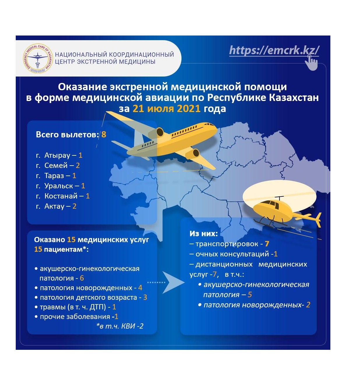 Оказание экстренной медицинской помощи в форме медицинской авиации по Республике Казахстан за 21 июля 2021 года