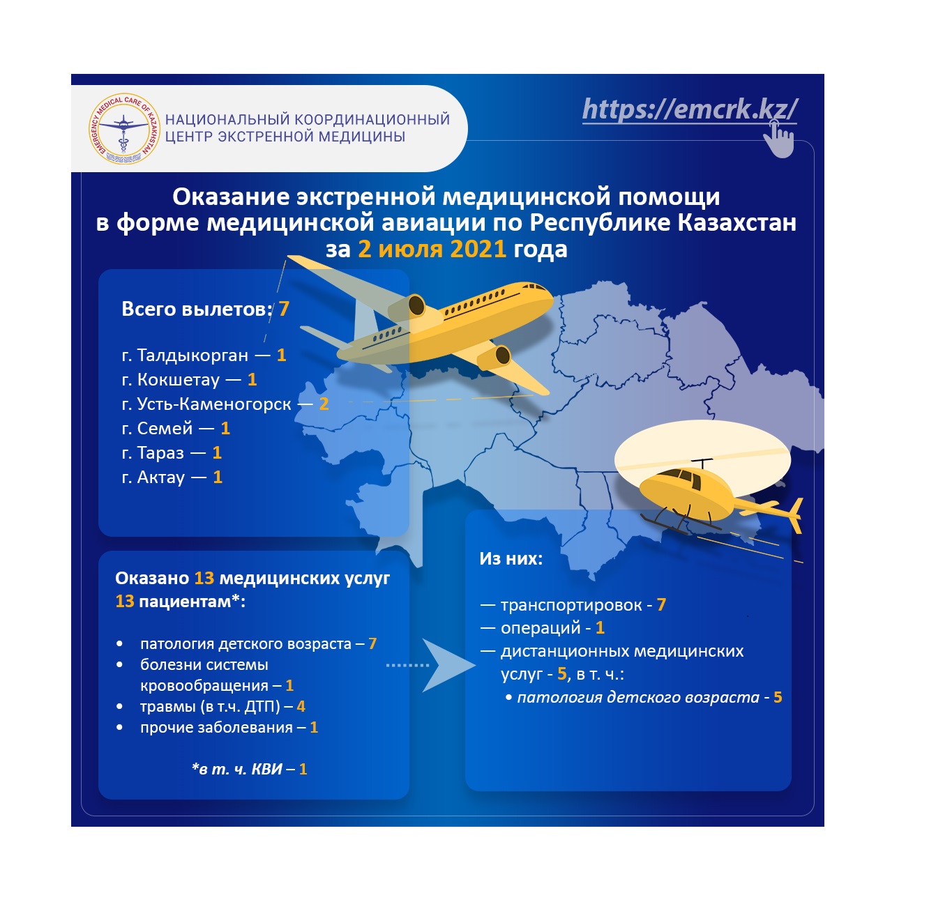 Оказание экстренной медицинской помощи в форме медицинской авиации по Республике Казахстан за 2 июля 2021 года