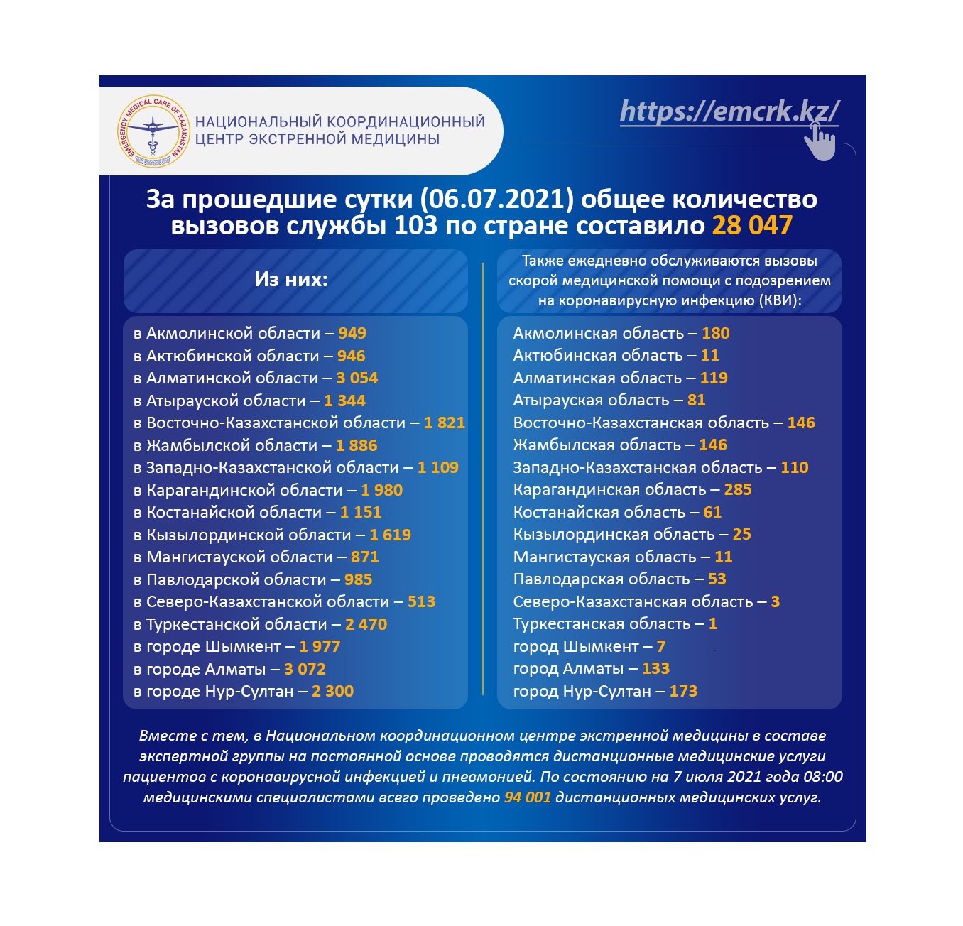 За прошедшие сутки (06.07.2021) общее количество вызовов службы 103 по стране составило 28 047