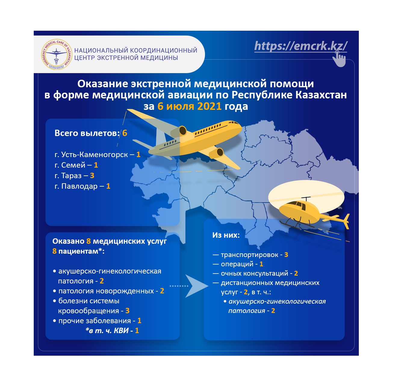 Оказание экстренной медицинской помощи в форме медицинской авиации по Республике Казахстан за 6 июля 2021 года