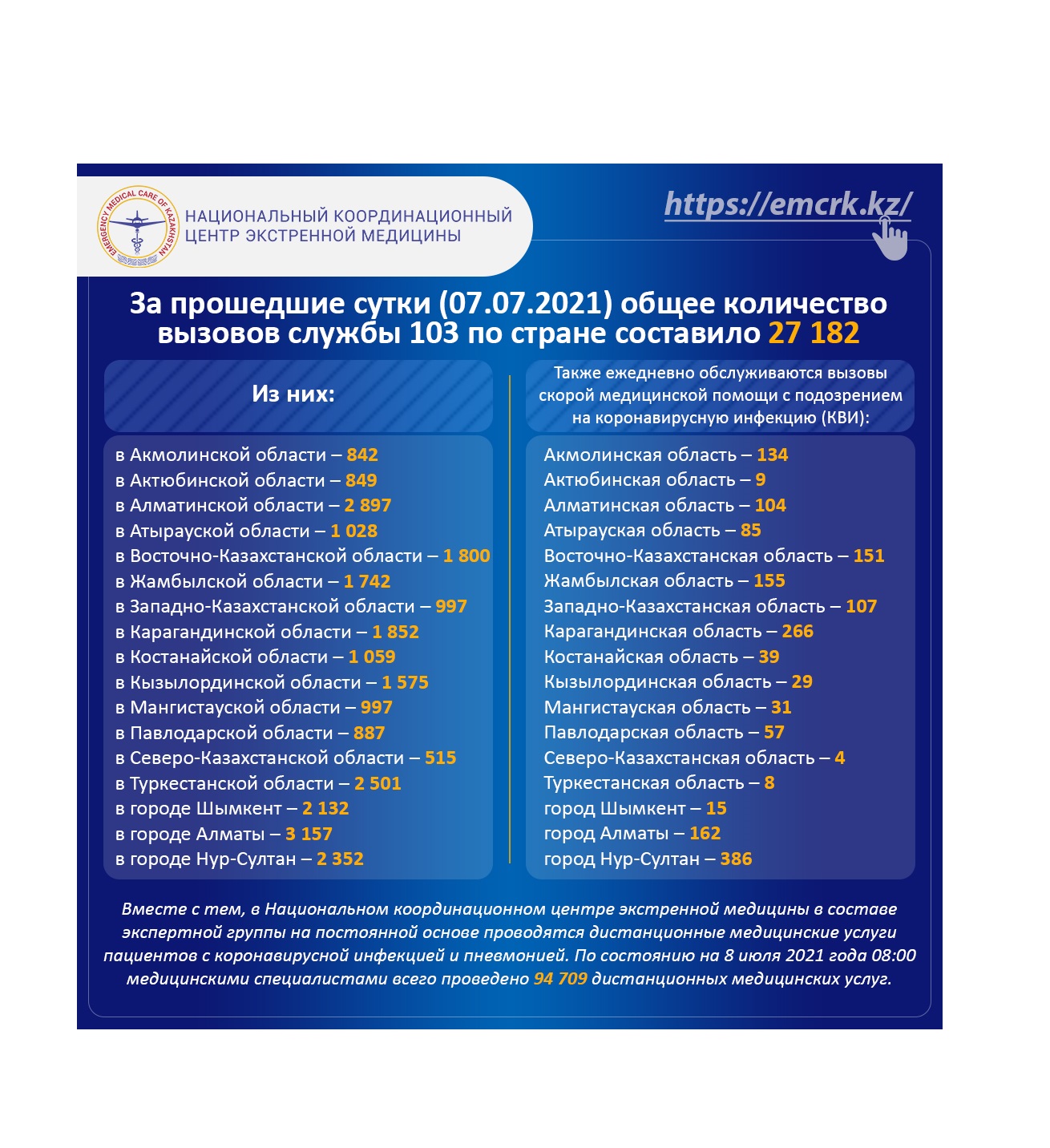 За прошедшие сутки (07.07.2021) общее количество вызовов службы 103 по стране составило 27 182
