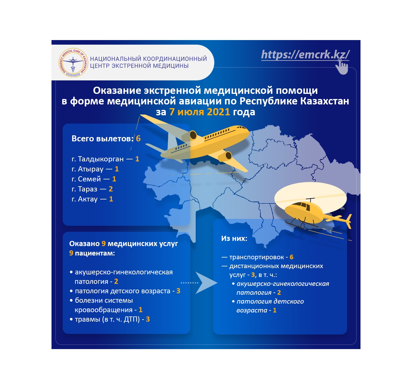 Оказание экстренной медицинской помощи в форме медицинской авиации по Республике Казахстан за 7 июля 2021 года