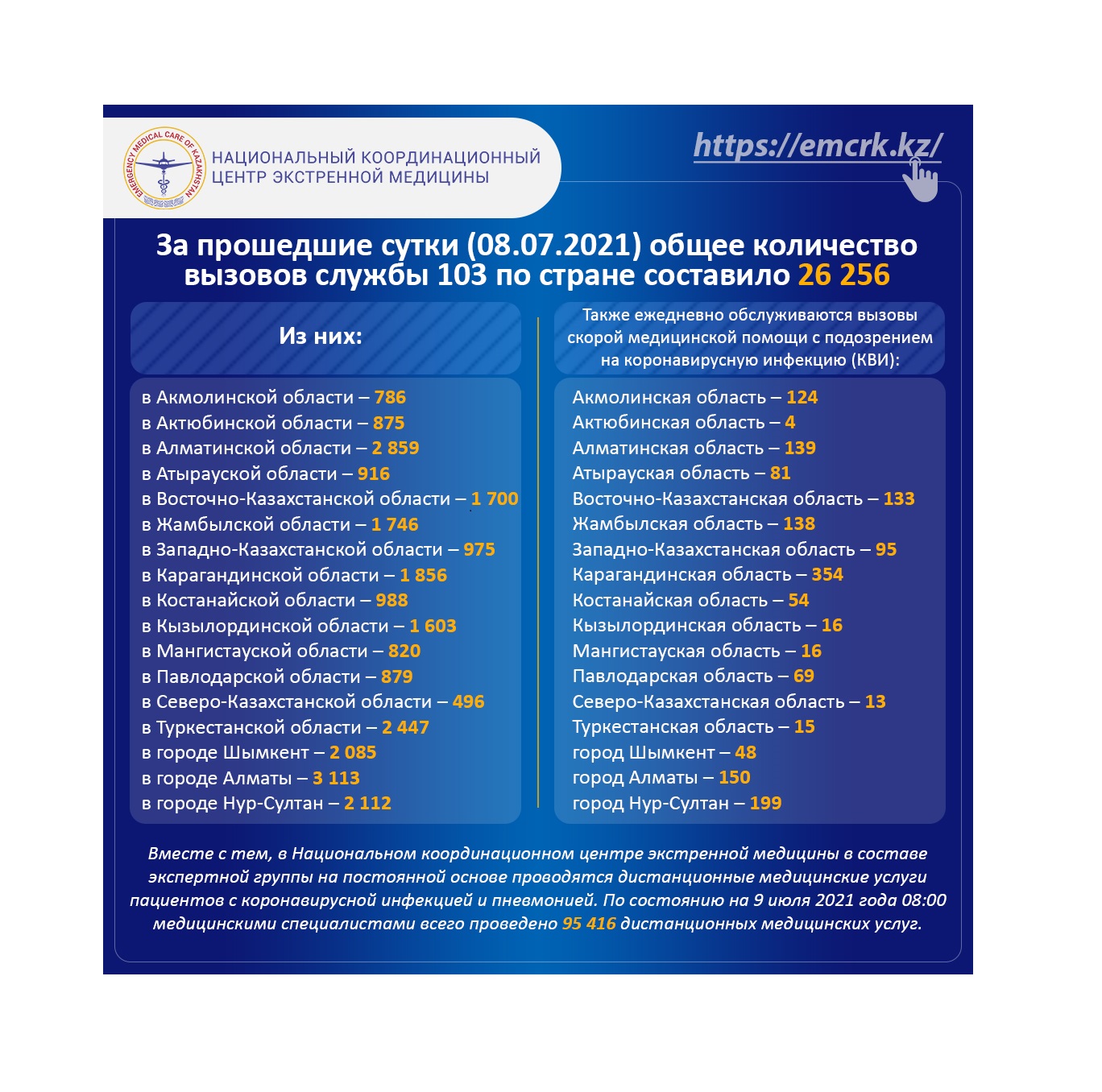 За прошедшие сутки (08.07.2021) общее количество вызовов службы 103 по стране составило 26 256