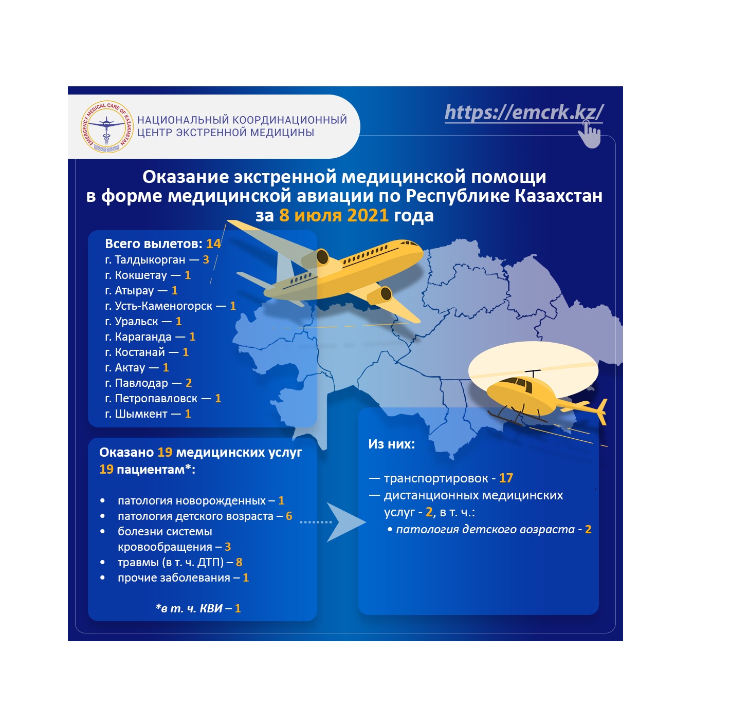 Оказание экстренной медицинской помощи в форме медицинской авиации по Республике Казахстан за 8 июля 2021 года