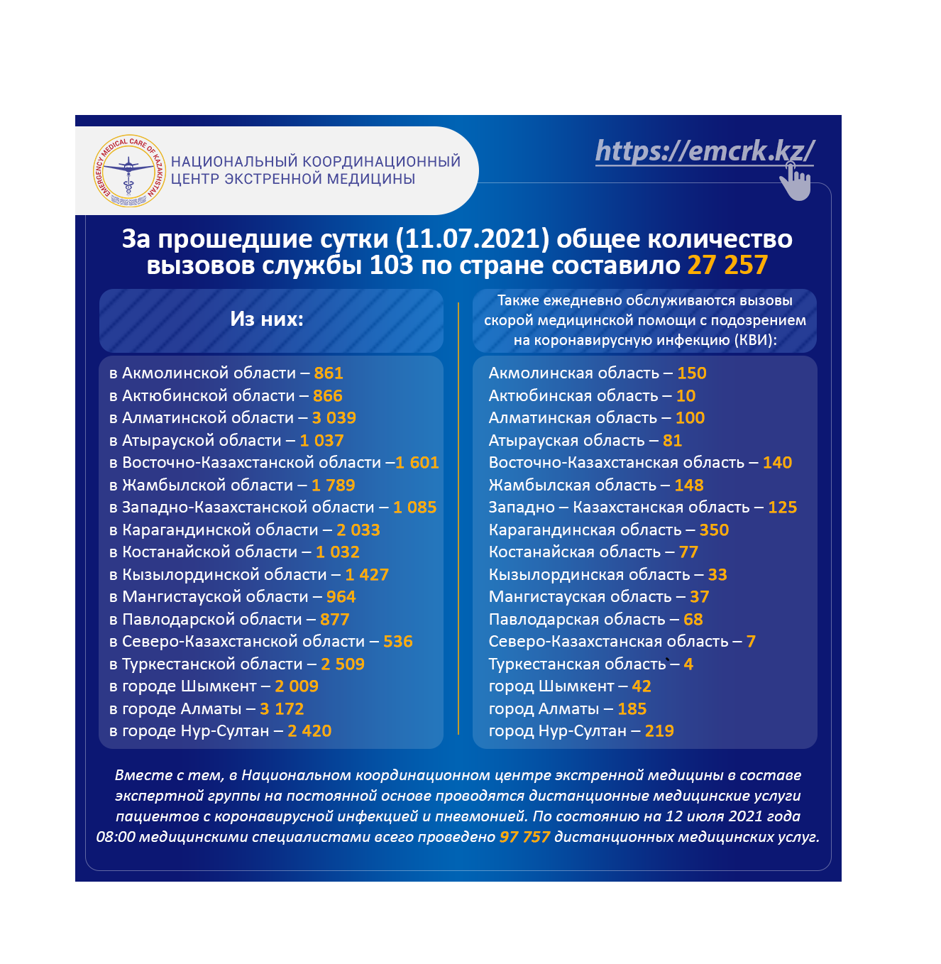 За прошедшие сутки (11.07.2021) общее количество вызовов службы 103 по стране составило 27 257