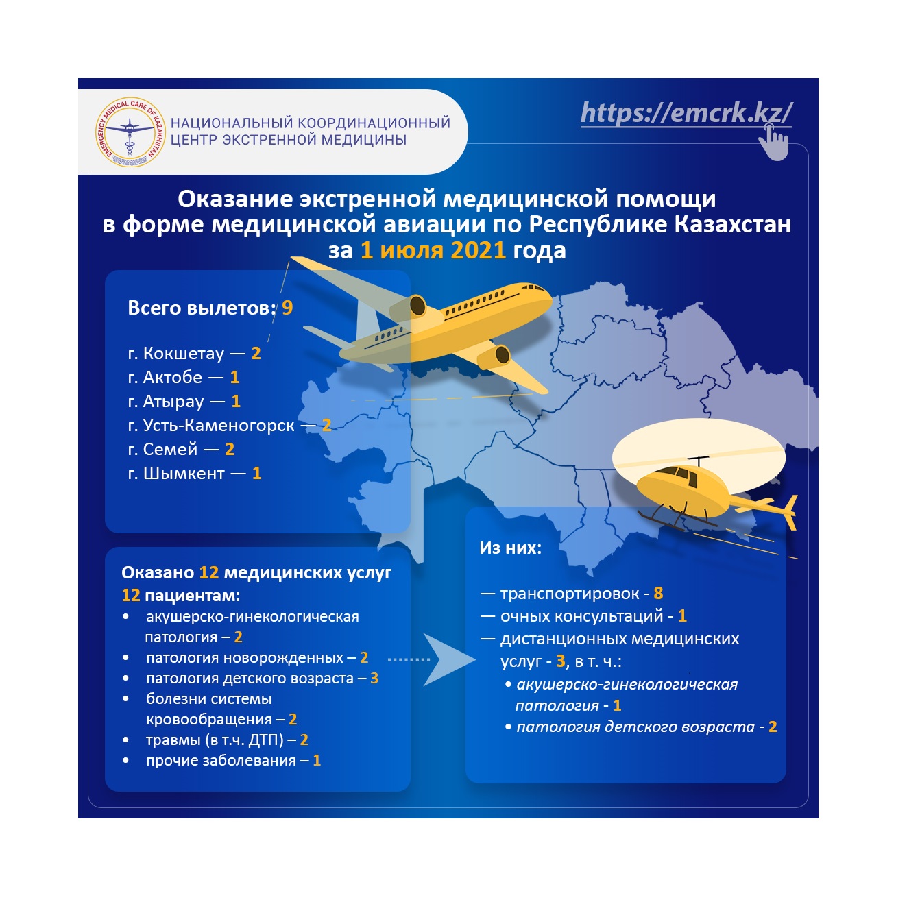 Оказание экстренной медицинской помощи в форме медицинской авиации по Республике Казахстан за 1 июля 2021 года