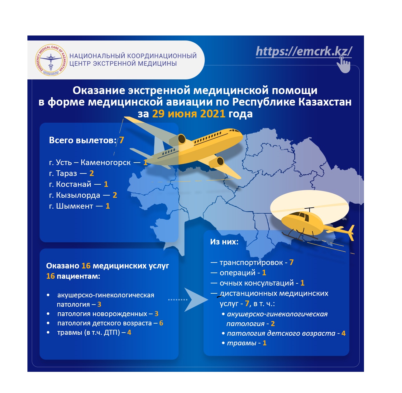 Оказание экстренной медицинской помощи в форме медицинской авиации по Республике Казахстан за 29 июня 2021 года