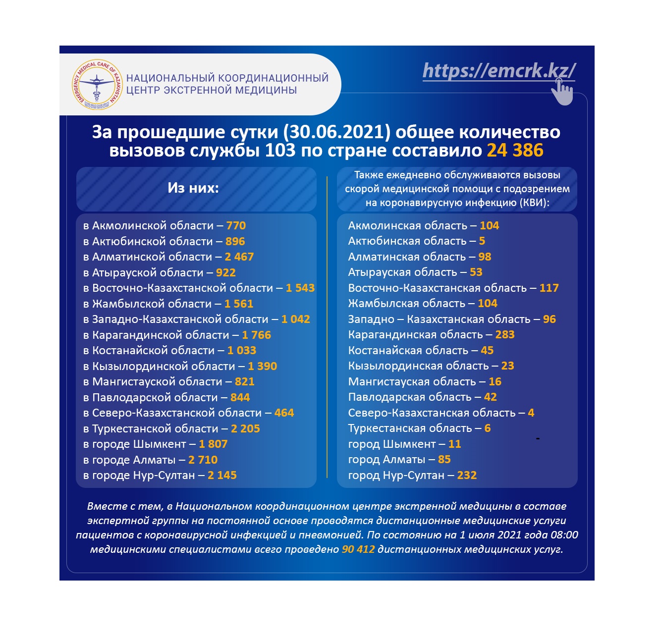 За прошедшие сутки (30.06.2021) общее количество вызовов службы 103 по стране составило 24 386