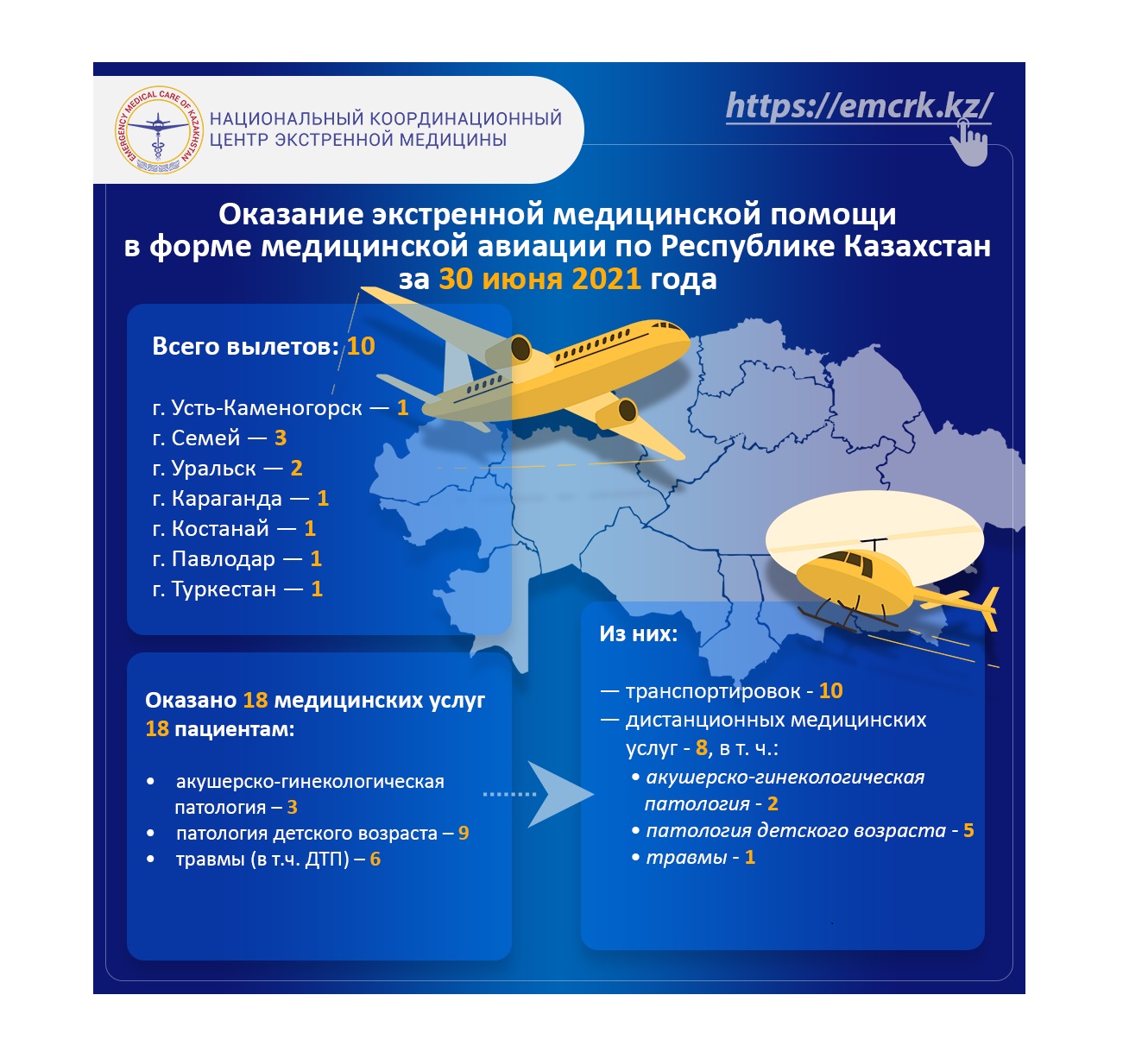 Оказание экстренной медицинской помощи в форме медицинской авиации по Республике Казахстан за 30 июня 2021 года