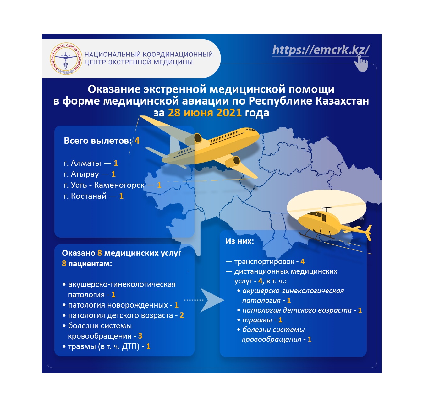 Оказание экстренной медицинской помощи в форме медицинской авиации по Республике Казахстан за 28 июня 2021 года