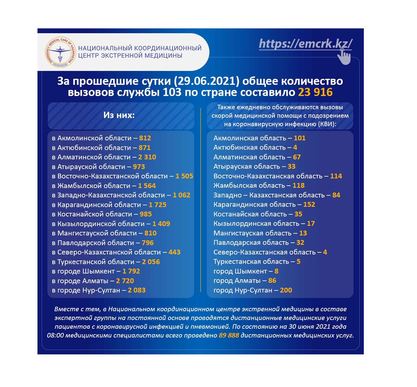 За прошедшие сутки (29.06.2021) общее количество вызовов службы 103 по стране составило 23 916