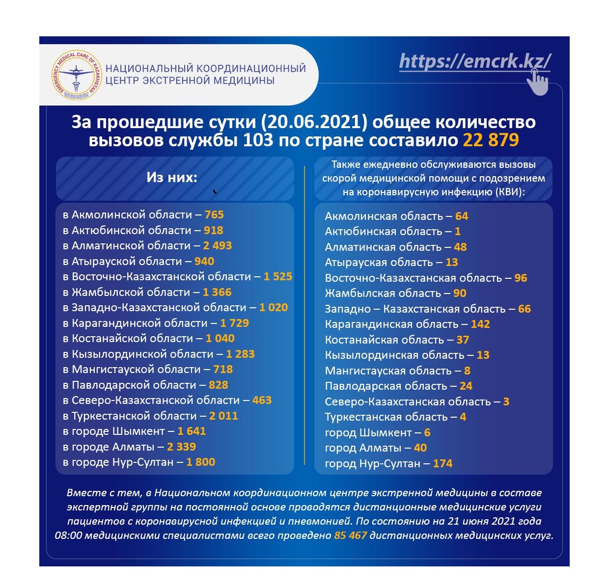 За прошедшие сутки (20.06.2021) общее количество вызовов службы 103 по стране составило 22 879