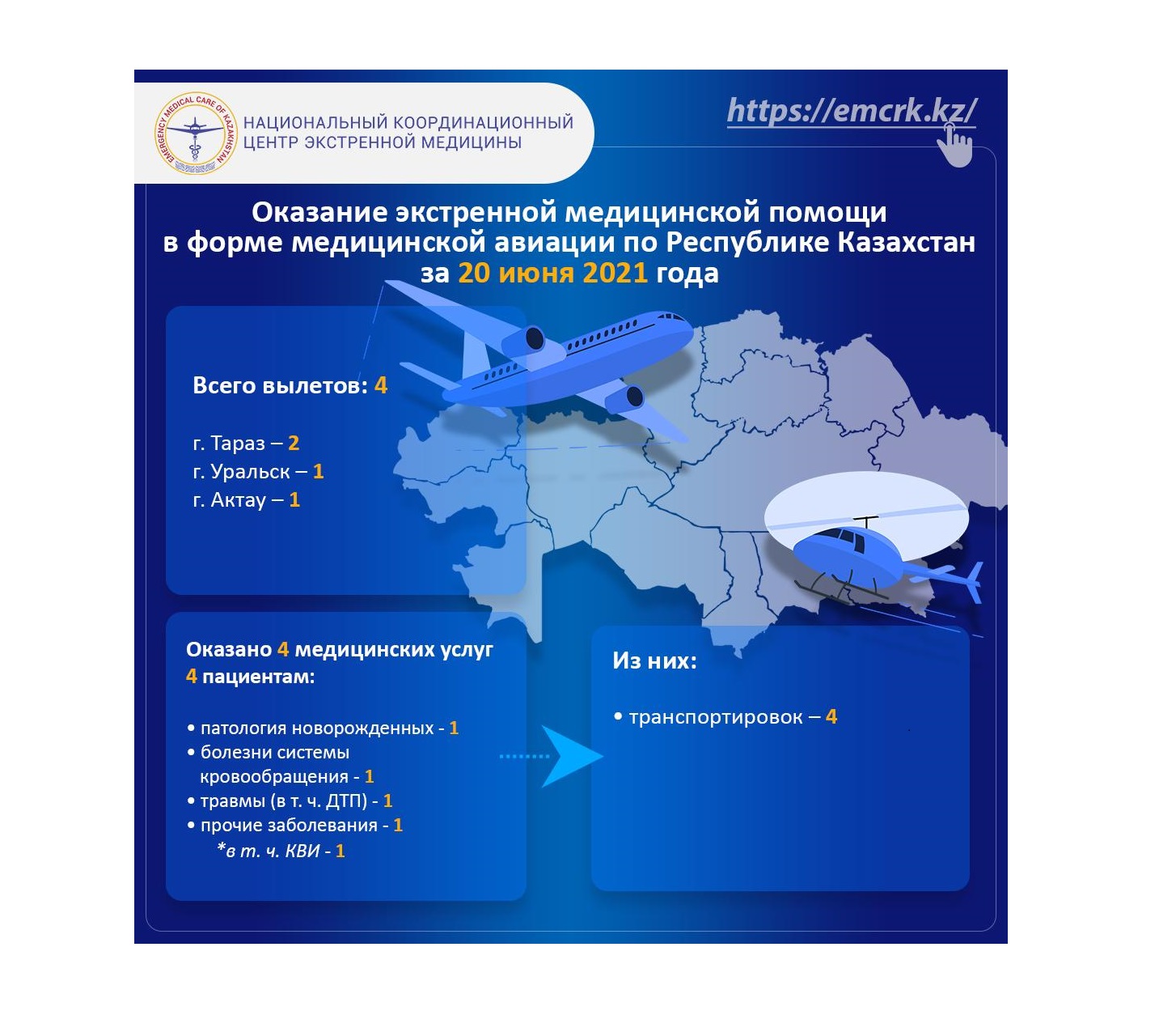 Оказание экстренной медицинской помощи в форме медицинской авиации по Республике Казахстан за 20 июня 2021 года