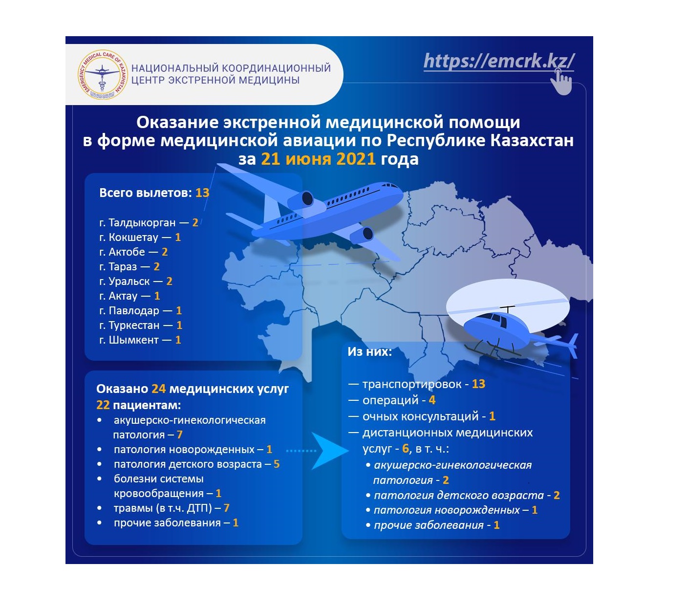 Оказание экстренной медицинской помощи в форме медицинской авиации по Республике Казахстан за 21 июня 2021 года