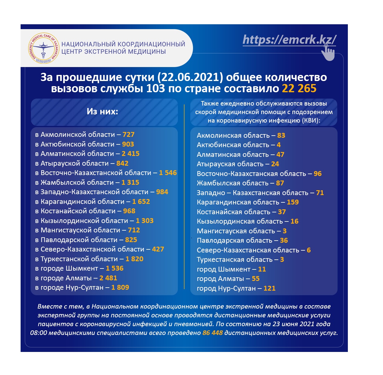 За прошедшие сутки (21.06.2021) общее количество вызовов службы 103 по стране составило 22 738