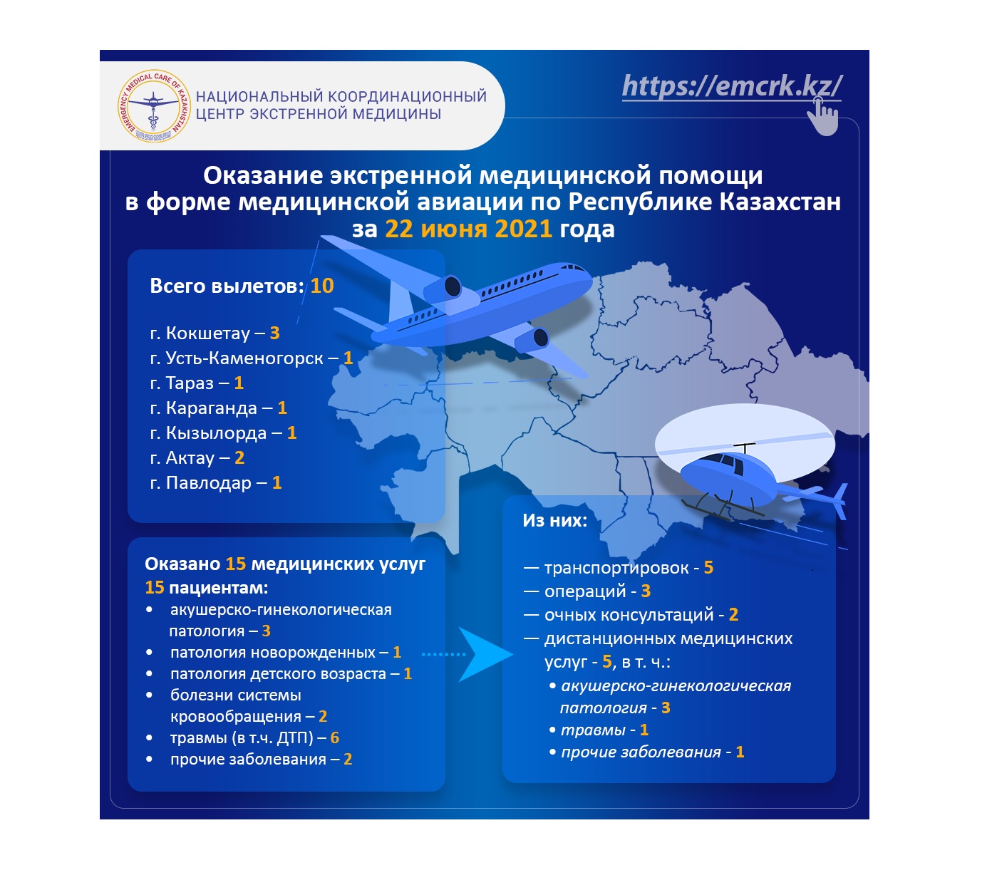 Оказание экстренной медицинской помощи в форме медицинской авиации по Республике Казахстан за 22 июня 2021 года