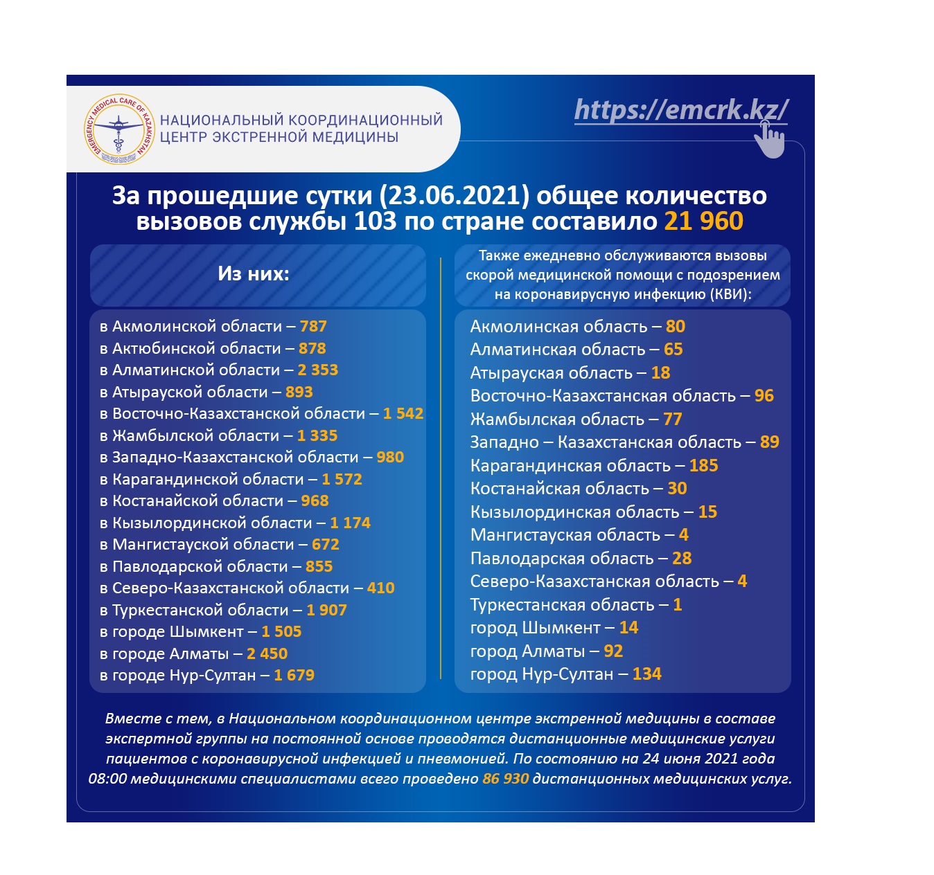 За прошедшие сутки (23.06.2021) общее количество вызовов службы 103 по стране составило 21 960
