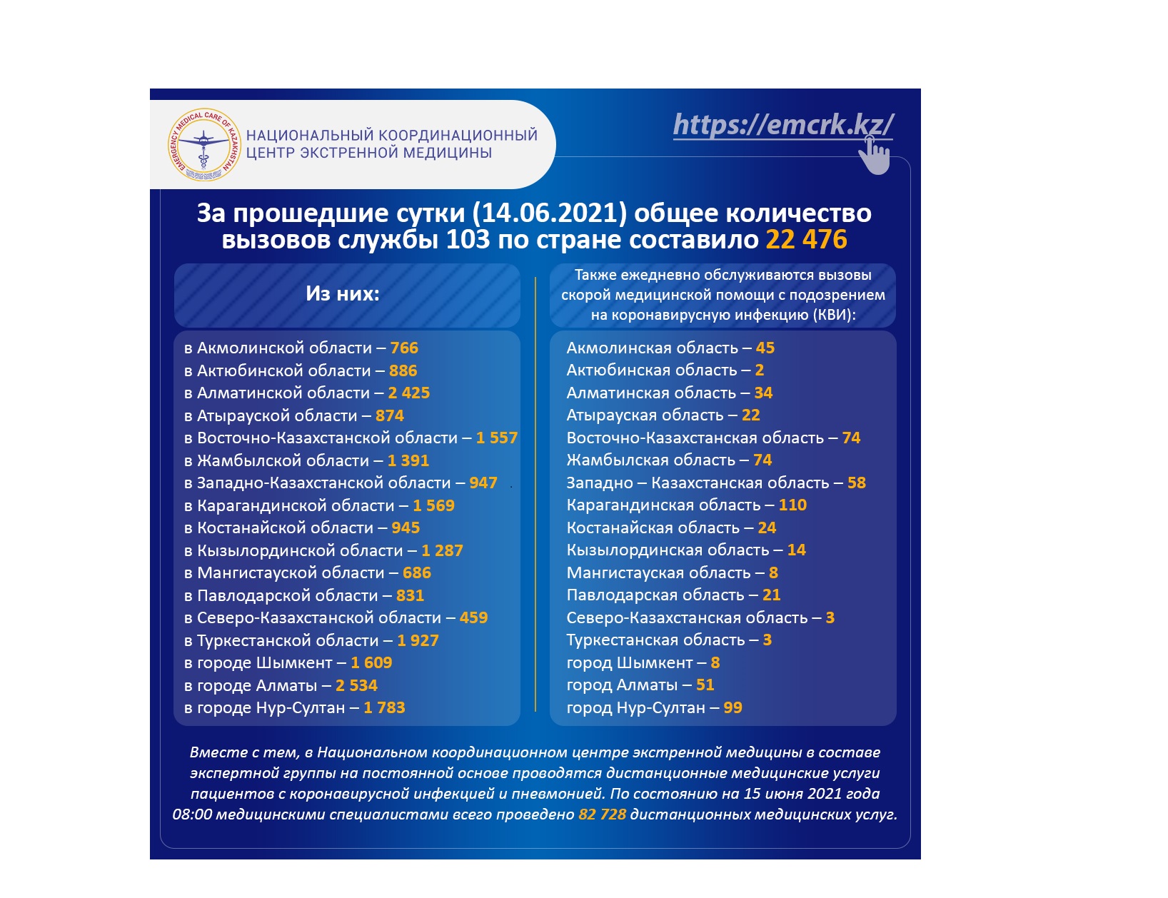 За прошедшие сутки (14.06.2021) общее количество вызовов службы 103 по стране составило 22 476
