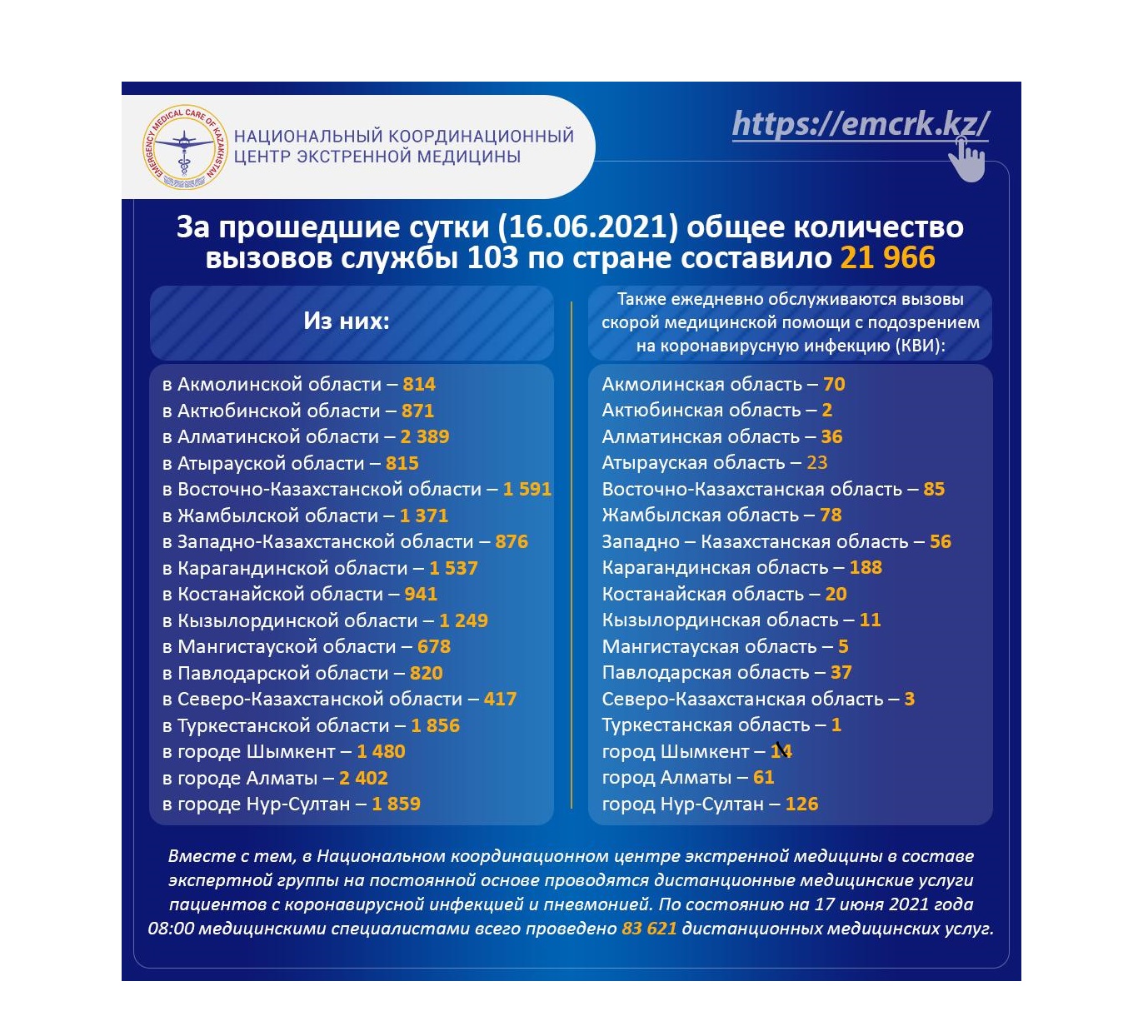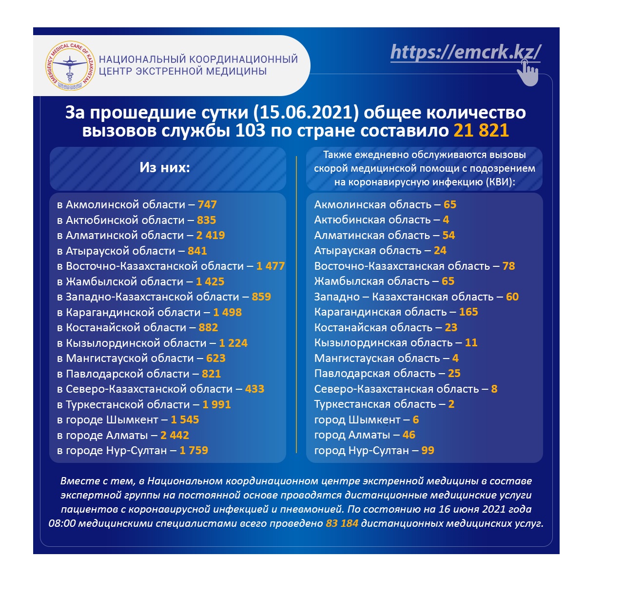 За прошедшие сутки (16.06.2021) общее количество вызовов службы 103 по стране составило 21 966