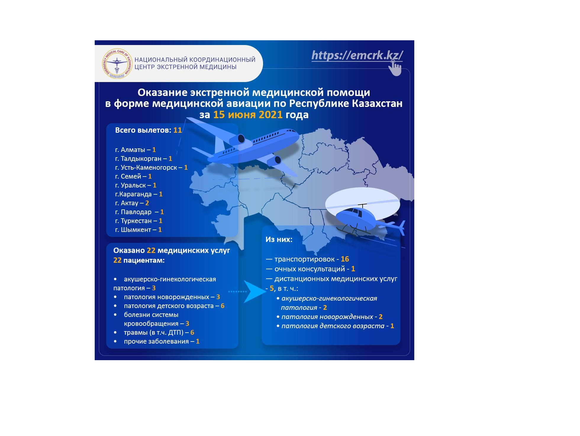 Оказание экстренной медицинской помощи в форме медицинской авиации по Республике Казахстан за 16 июня 2021 года