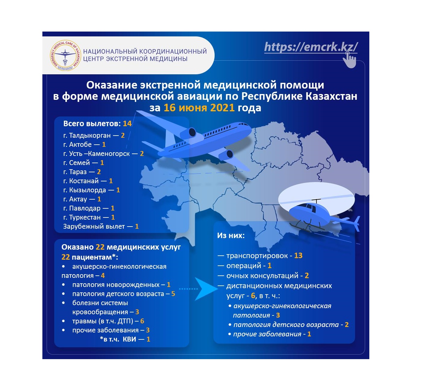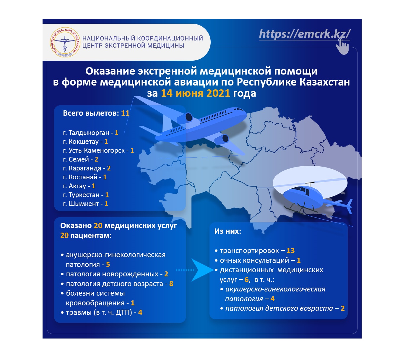 Оказание экстренной медицинской помощи в форме медицинской авиации по Республике Казахстан за 14 июня 2021 года
