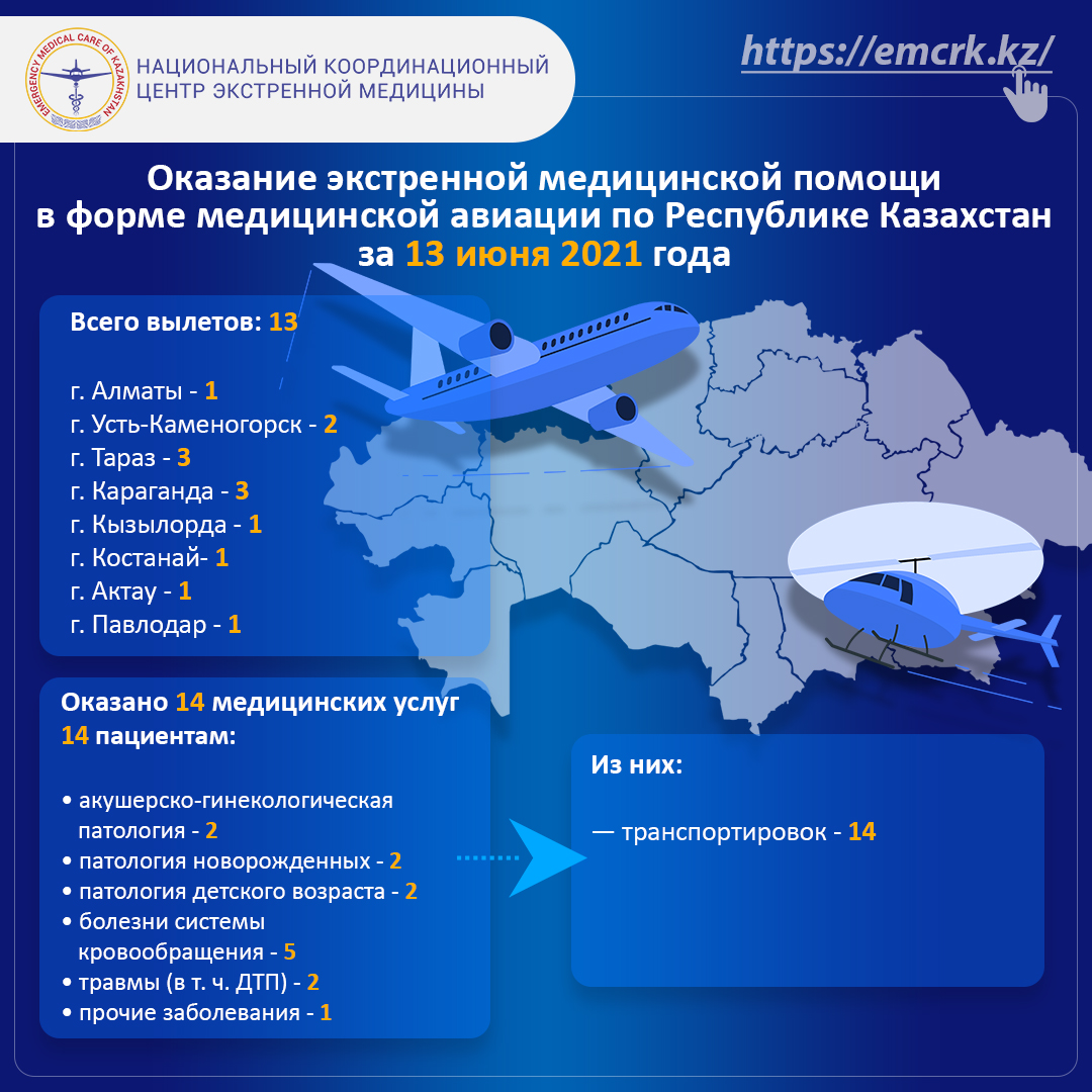 Оказание экстренной медицинской помощи в форме медицинской авиации по Республике Казахстан за 13 июня 2021 года