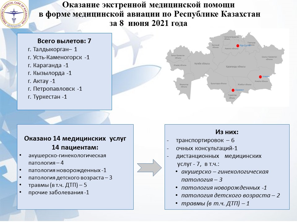 Оказание экстренной медицинской помощи в форме медицинской авиации по Республике Казахстан за 8 июня 2021 года