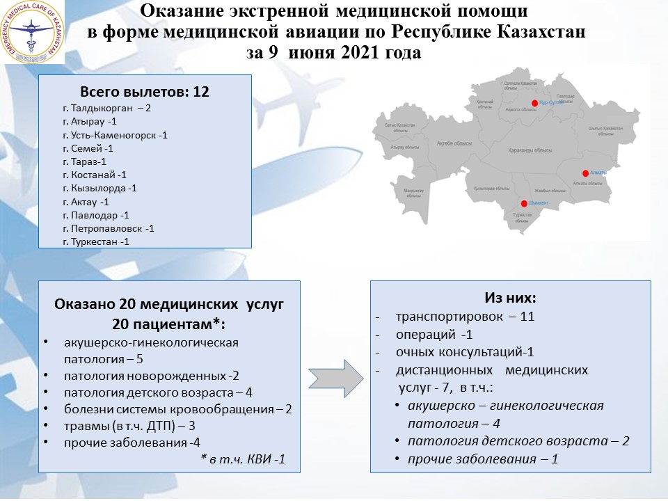 Оказание экстренной медицинской помощи в форме медицинской авиации по Республике Казахстан за 9 июня 2021 года