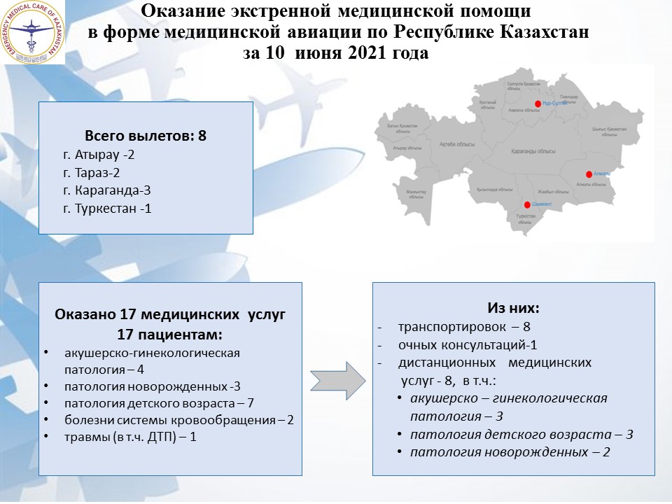 Оказание экстренной медицинской помощи в форме медицинской авиации по Республике Казахстан за 10 июня 2021 года