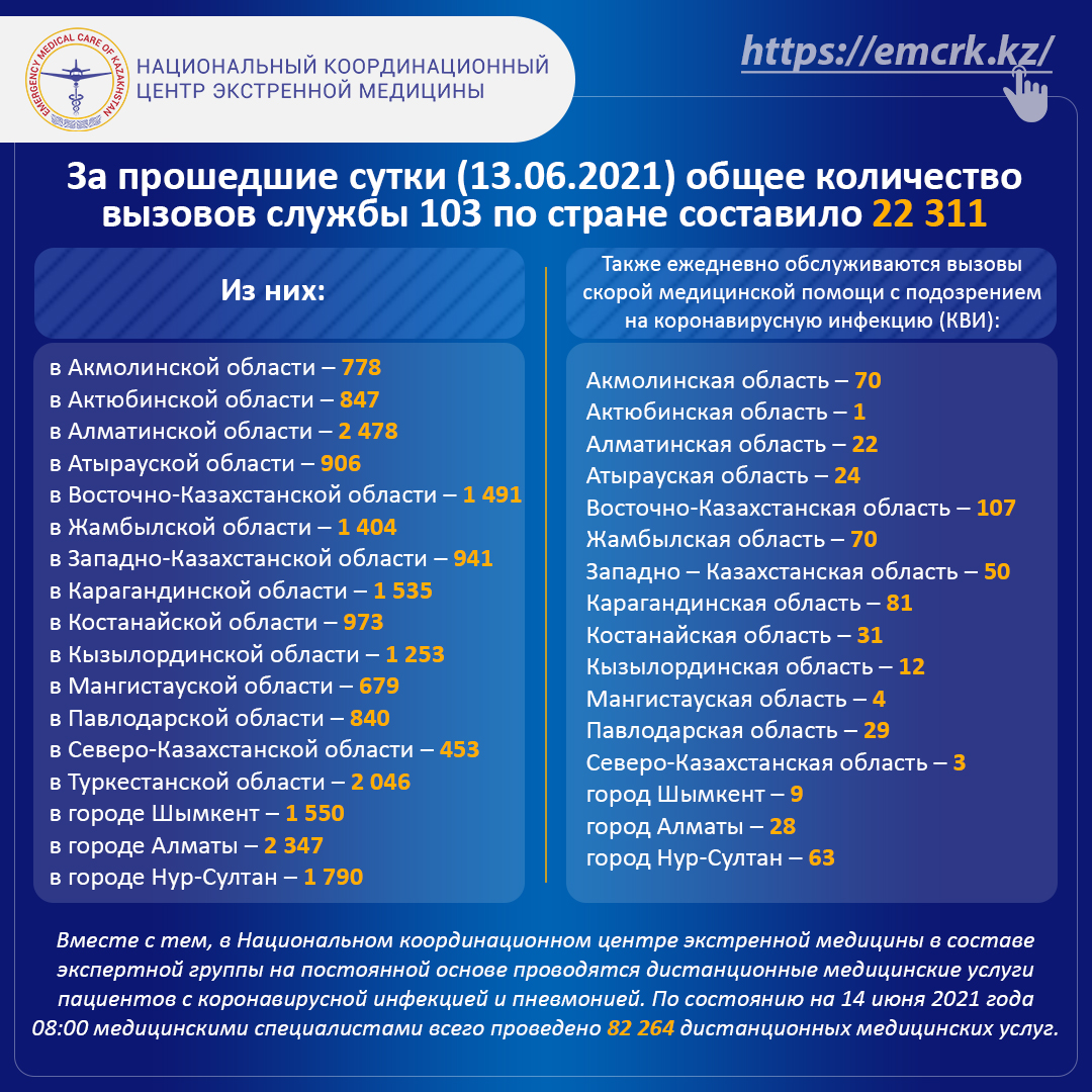 За прошедшие сутки (13.06.2021) общее количество вызовов службы 103 по стране составило 22 311