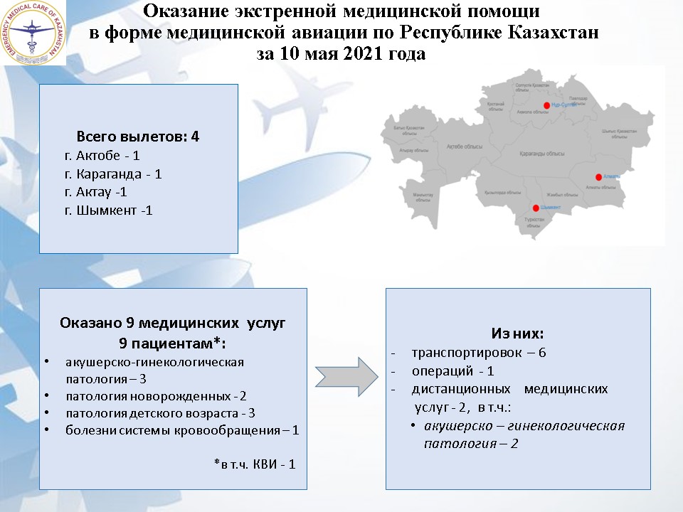 Оказание экстренной медицинской помощи в форме медицинской авиации по Республике Казахстан за 10 мая 2021 года