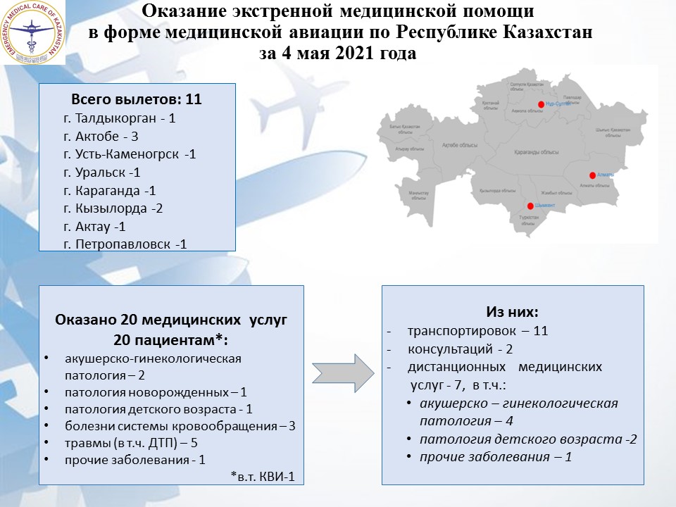 Оказание экстренной медицинской помощи в форме медицинской авиации по Республике Казахстан за 4 мая 2021 года