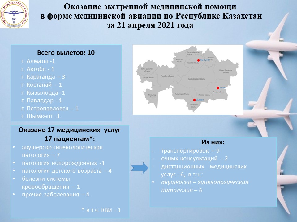 Оказание экстренной медицинской помощи в форме медицинской авиации по Республике Казахстан за 21 апреля 2021 года