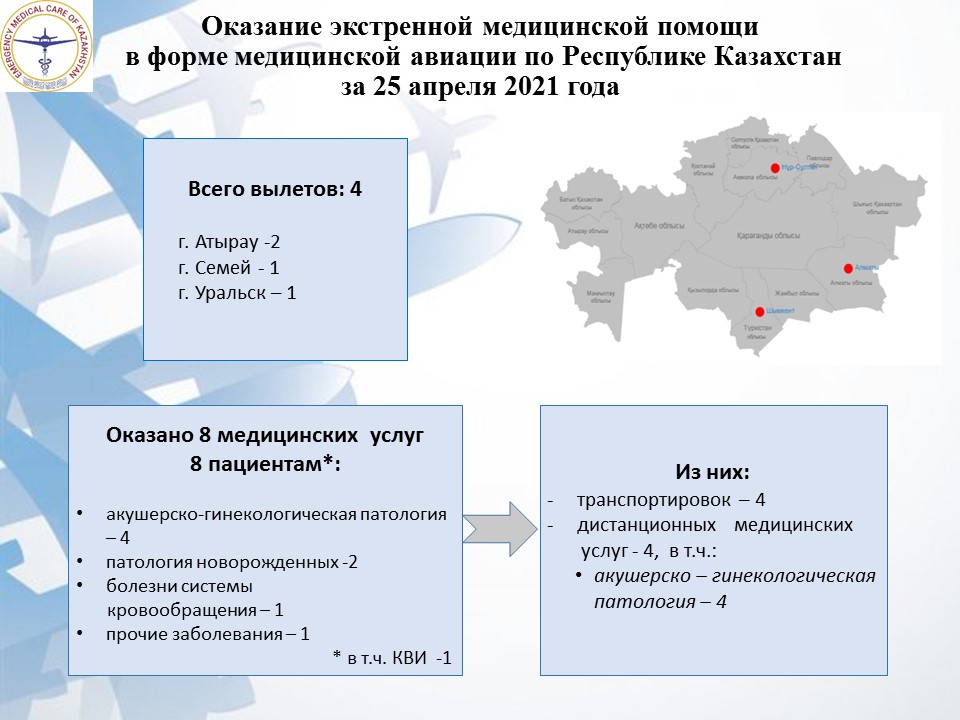Оказание экстренной медицинской помощи в форме медицинской авиации по Республике Казахстан за 25 апреля 2021 года