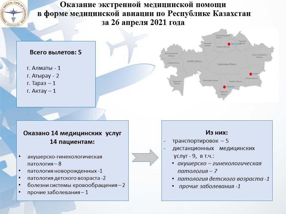 Оказание экстренной медицинской помощи в форме медицинской авиации по Республике Казахстан за 26 апреля 2021 года