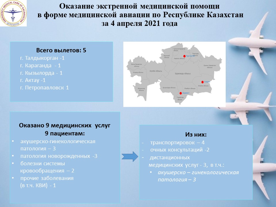 Оказание экстренной медицинской помощи в форме медицинской авиации по Республике Казахстан за 4 апреля 2021 года